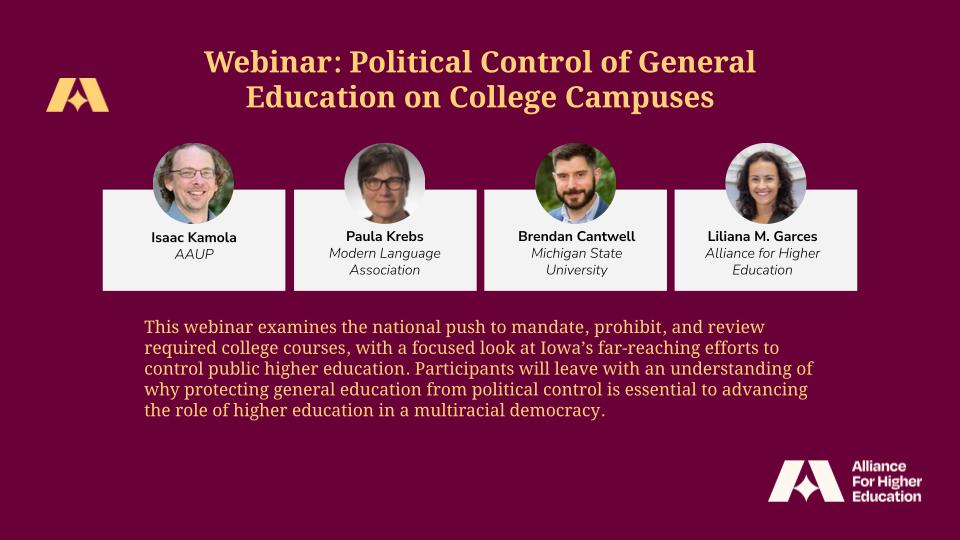 In an April webinar hosted by the Alliance for Higher Education, a panel of leading scholars argued that recent legislative efforts—most notably in Iowa, Florida, and Texas—represent a fundamental breakdown of the historic relationship between state governments and public universities. The conversation, titled “Political Control of General Education on College Campuses,” explored how partisan actors are increasingly replacing academic expertise with political authority to shape what students must learn to graduate.